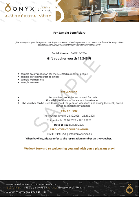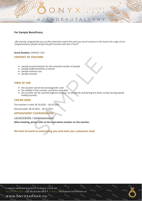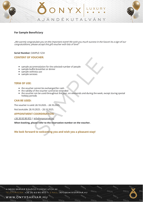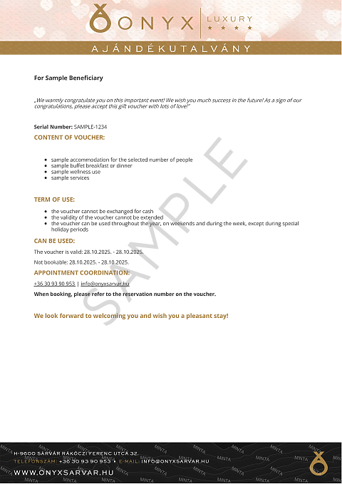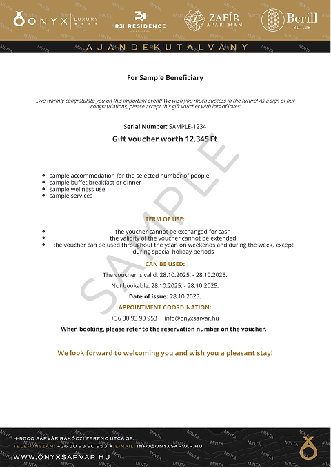 - The voucher can be deposited in the accommodation units like Berill Suites; R31 Residence and Onyx****Luxury operated by Sárvár-Ház Kft.